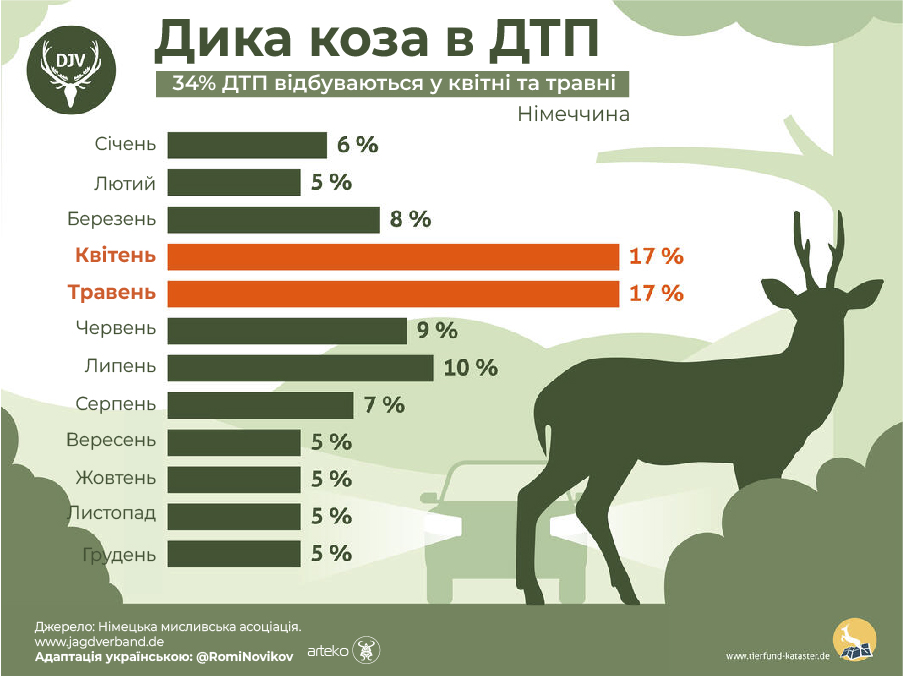 ДетальнішеБільшість ДТП за участю диких тварин на дорогах Німеччини трапляється у квітні та травні. Особливо критичним періодом доби є світанок. Такі висновки зробила Німецька мисливська асоціація (DJV), член FACE – European Federation for Hunting and Conservation, після аналізу інформації 69 500 випадків ДТП, які учасники дорожнього руху внесли до реєстру випадків з тваринами (tierfund-kataster.de) з …